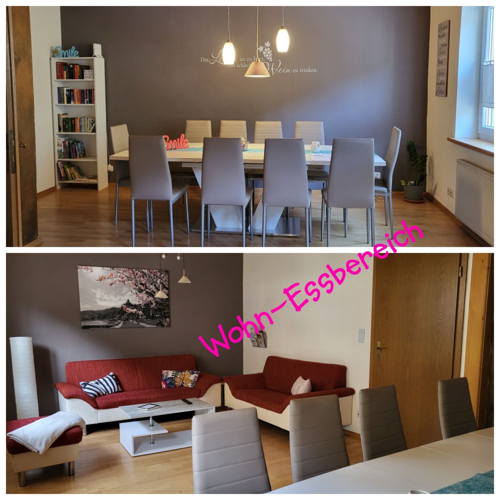 Ebenso befindet sich im 1 OG der Wohn/Essbereich: ein großer Esstisch lädt zum verweilen ein und bietet Platz für 10 Personen (falls sie mal einen Abend Besuch bekommen), ebenso ist er ausgestattet mit einer Couchgarnitur, einem Wlan-fähigen Fernseher und einem Bücher-tausch-Regal.